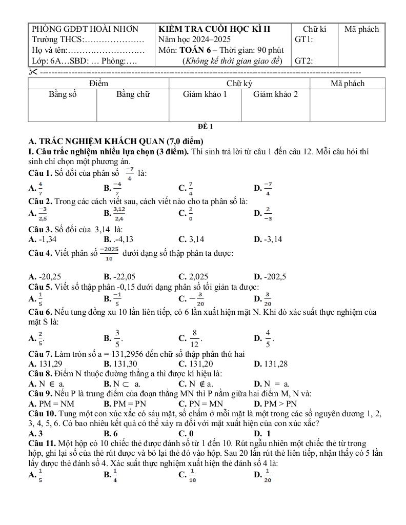 đề cuối học kỳ 2 toán 6 năm 2024 – 2025 phòng gd&đt hoài nhơn – bình định – nội dung then chốt trong chuyên mục
