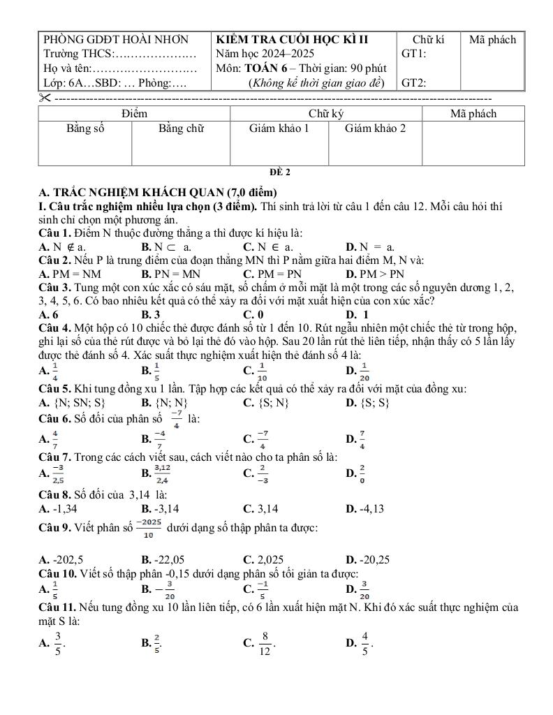 Giải Toán đề cuối học kỳ 2 toán 6 năm 2024 – 2025 phòng gd&đt hoài nhơn – bình định với Đáp Án Mới Nhất
