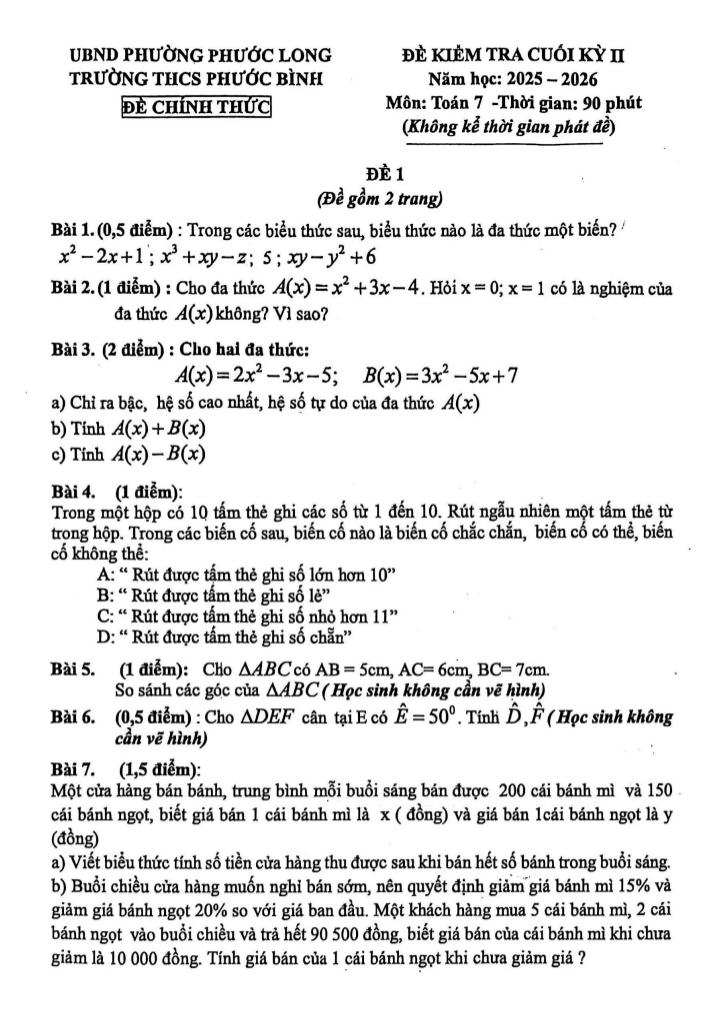 Trích dẫn Đề cuối học kỳ 2 Toán 7 năm 2025 – 2026 trường THCS Phước Bình – TP HCM: