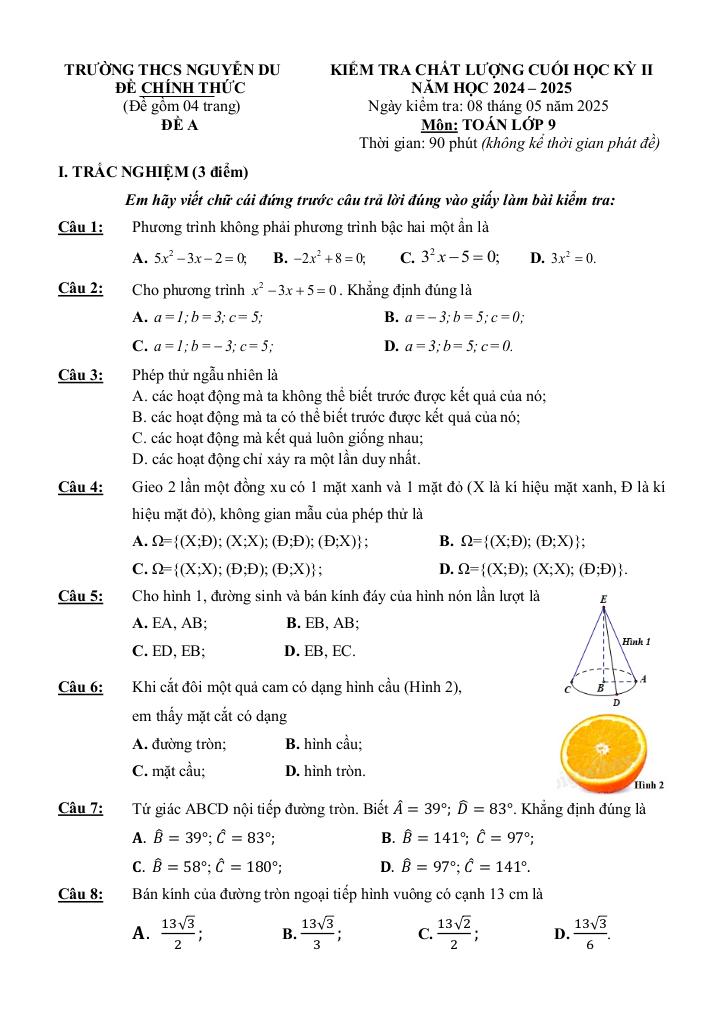 Giải Toán đề cuối học kỳ 2 toán 9 năm 2024 – 2025 trường thcs nguyễn du – lâm đồng với Đáp Án Mới Nhất