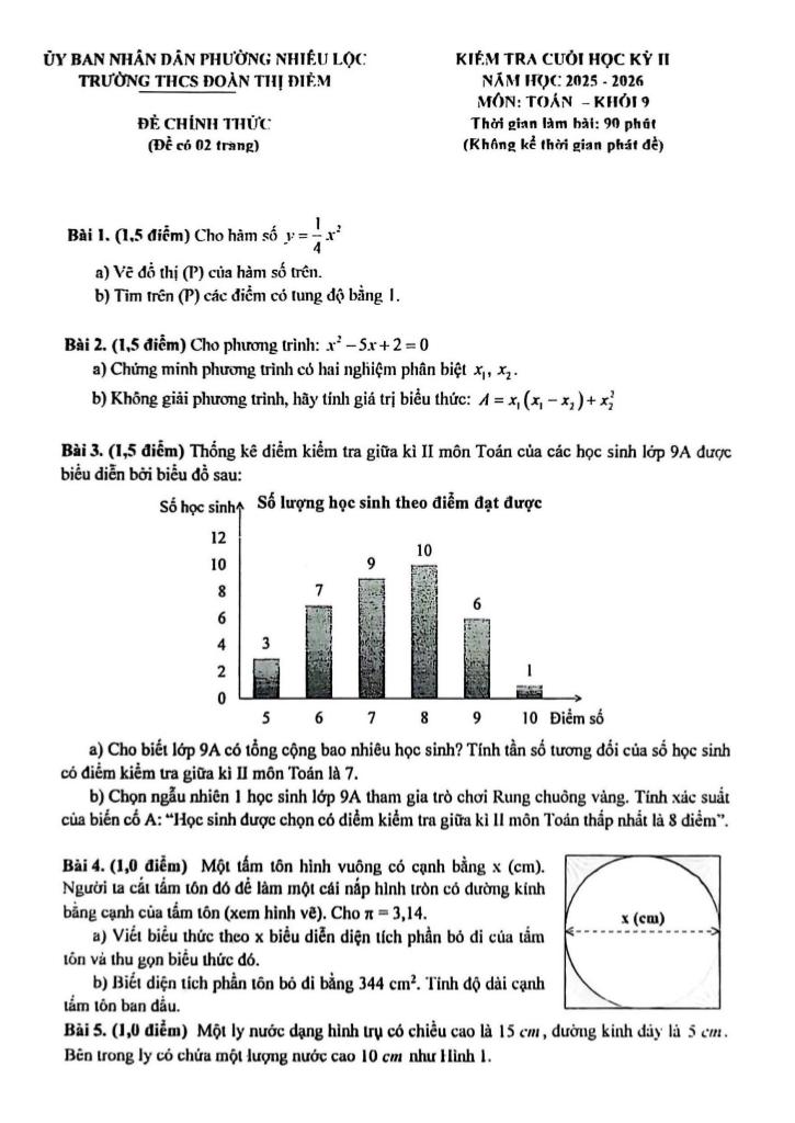 Trích dẫn Đề cuối học kỳ 2 Toán 9 năm 2025 – 2026 trường THCS Đoàn Thị Điểm – TP HCM: