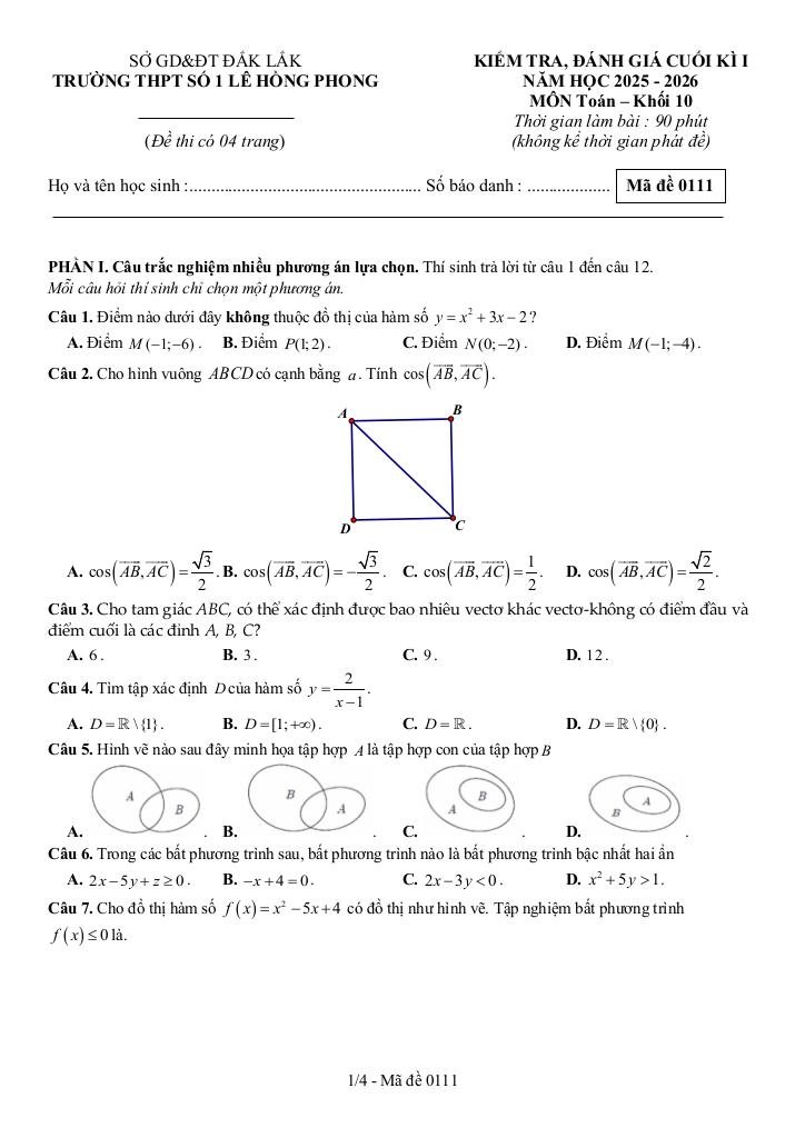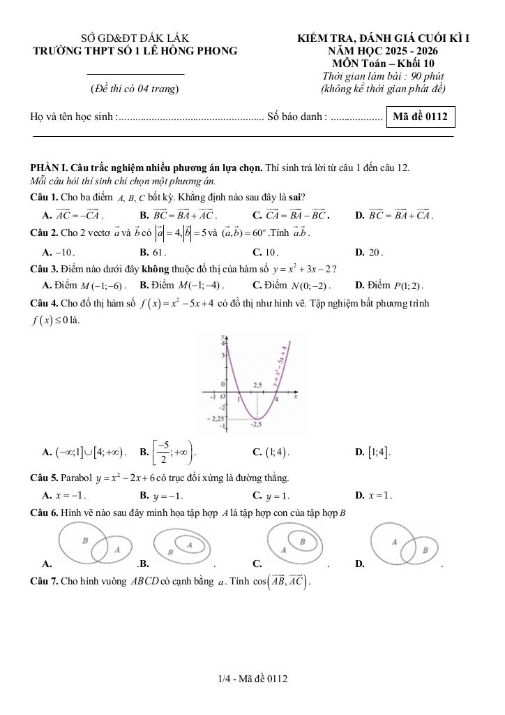 Trích dẫn Đề cuối kì 1 Toán 10 năm 2025 – 2026 trường THPT Lê Hồng Phong 1 – Đắk Lắk: