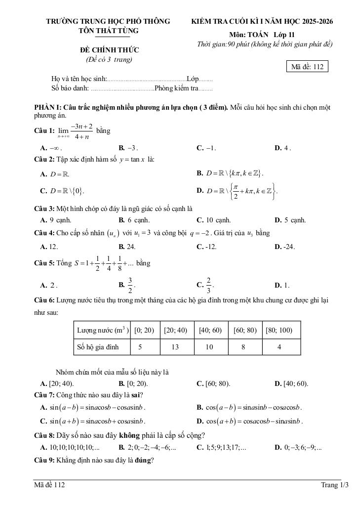 Trích dẫn Đề cuối kì 1 Toán 11 năm 2025 – 2026 trường THPT Tôn Thất Tùng – Đà Nẵng: