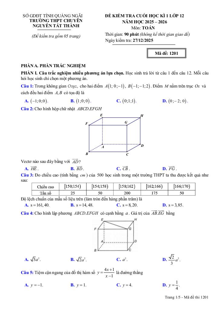 Trích dẫn Đề cuối kì 1 Toán 12 năm 2025 – 2026 trường chuyên Nguyễn Tất Thành – Quảng Ngãi: