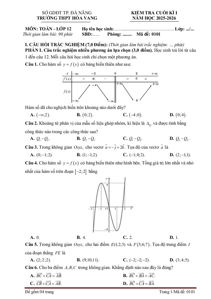 Giải Toán đề cuối kì 1 toán 12 năm 2025 – 2026 trường thpt hòa vang – đà nẵng với Đáp Án Mới Nhất