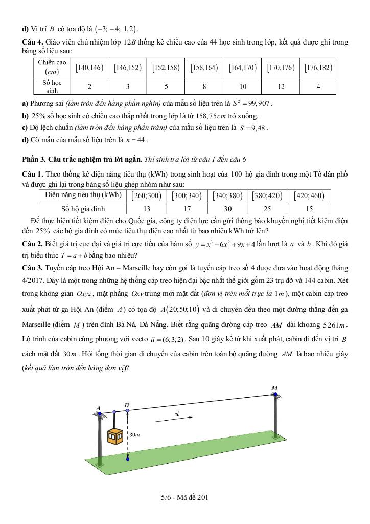 + Tuyến cáp treo Hội An – Marseille hay còn gọi là tuyến cáp treo số 4 được đưa vào hoạt động tháng 4/2017. Đây là một trong những hệ thống cáp treo hiện đại bậc nhất thế giới gồm 23 trụ đỡ và 144 cabin. Xét trong không gian Oxyz, mặt phẳng Oxy trùng mới mặt đất (đơn vị trên mỗi trục là 1m), một cabin cáp treo xuất phát từ ga Hội An (điểm A) có tọa độ A(20;50;10) và di chuyển đều theo một đường thẳng đến ga Marseille (điểm M) trên đỉnh Bà Nà, Đà Nẵng. Biết rằng quãng đường cáp treo AM dài khoảng 5261m. Lộ trình của cabin cùng phương với vectơ u = (6;3;2). Sau 10 giây kể từ khi xuất phát, cabin đi đến vị trí B cách mặt đất 30m. Hỏi tổng thời gian di chuyển của cabin trên toàn bộ quãng đường AM là bao nhiêu giây (kết quả làm tròn đến hàng đơn vị)?