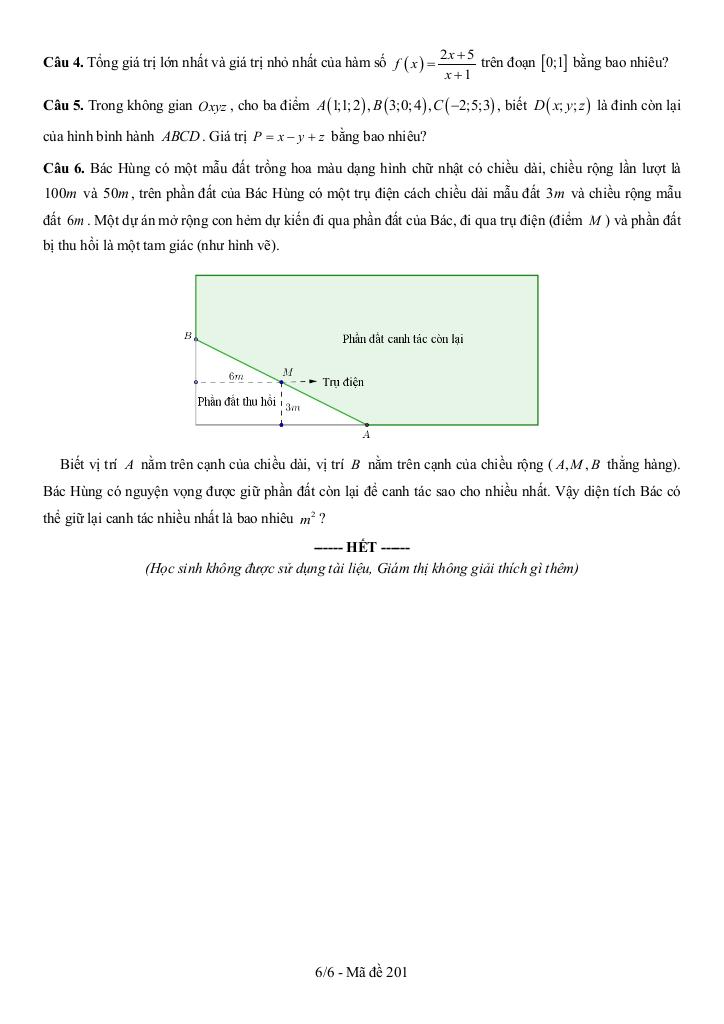 + Bác Hùng có một mẫu đất trồng hoa màu dạng hình chữ nhật có chiều dài, chiều rộng lần lượt là 100m và 50m, trên phần đất của Bác Hùng có một trụ điện cách chiều dài mẫu đất 3m và chiều rộng mẫu đất 6m. Một dự án mở rộng con hẻm dự kiến đi qua phần đất của Bác, đi qua trụ điện (điểm M) và phần đất bị thu hồi là một tam giác (như hình vẽ). Biết vị trí A nằm trên cạnh của chiều dài, vị trí B nằm trên cạnh của chiều rộng (A, M, B thẳng hàng). Bác Hùng có nguyện vọng được giữ phần đất còn lại để canh tác sao cho nhiều nhất. Vậy diện tích Bác có thể giữ lại canh tác nhiều nhất là bao nhiêu m2?