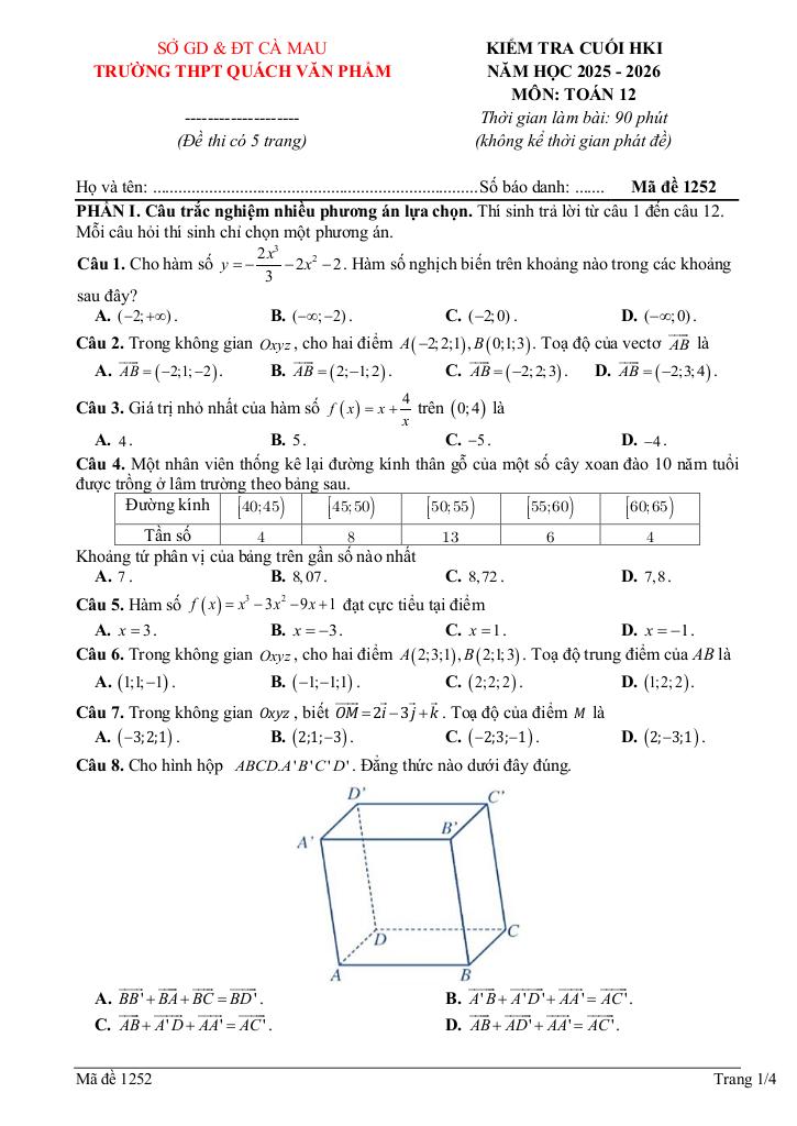 Trích dẫn Đề cuối kì 1 Toán 12 năm 2025 – 2026 trường THPT Quách Văn Phẩm – Cà Mau: