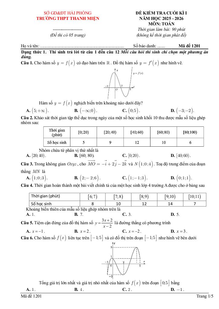 giaitoan.edu.vn giới thiệu đến quý thầy, cô giáo và các em học sinh đề kiểm tra cuối học kì 1 môn Toán 12 năm học 2025 – 2026 trường THPT Thanh Miện, thành phố Hải Phòng. Đề thi có đáp án mã đề 1201 – 1202.