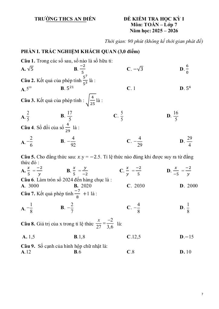 Trích dẫn Đề cuối kì 1 Toán 7 năm 2025 – 2026 trường THCS An Điền – TP HCM: