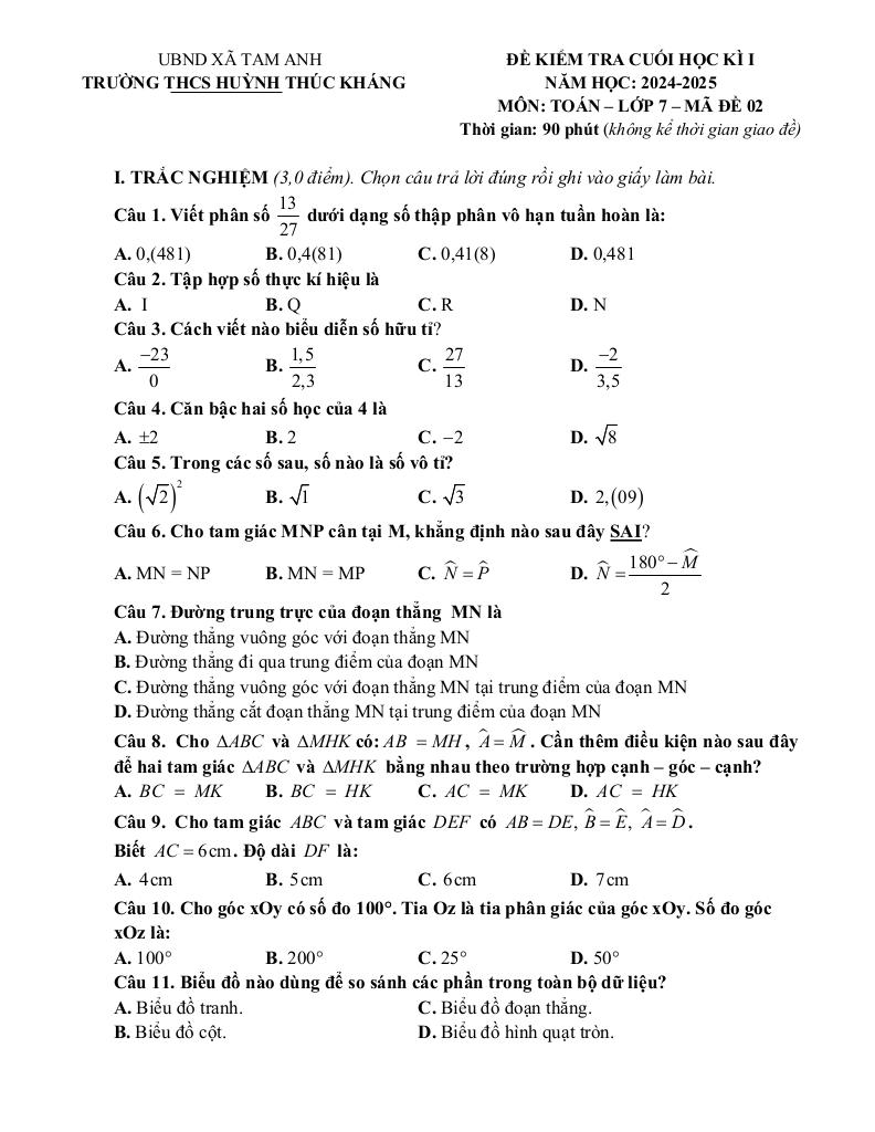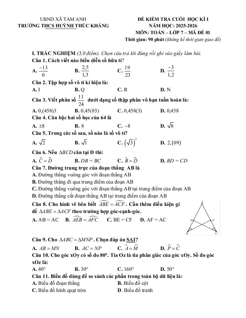Toán học luôn là một môn học quan trọng, giúp học sinh phát triển tư duy logic và kỹ năng giải quyết vấn đề. Để hỗ trợ các bạn học sinh và giáo viên trong việc học tập và giảng dạy, bài viết này sẽ cung cấp lời giải chi tiết và đáp án chính xác cho chủ đề đề cuối kì 1 toán 7 năm 2025 – 2026 trường thcs huỳnh thúc kháng – đà nẵng, giúp bạn hiểu sâu và tự tin hơn khi làm bài tập.