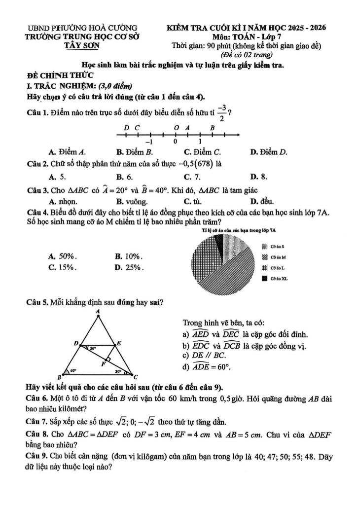 Trích dẫn Đề cuối kì 1 Toán 7 năm 2025 – 2026 trường THCS Tây Sơn – Đà Nẵng: