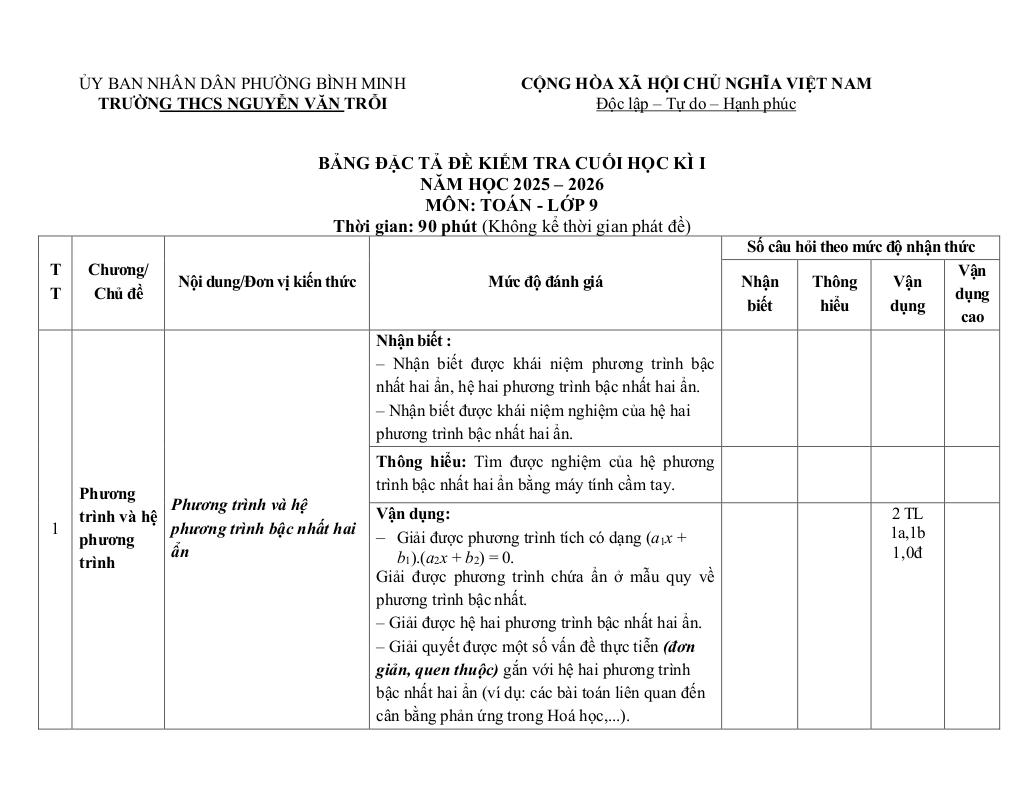 Ma trận Đề cuối kì 1 Toán 9 năm 2025 – 2026 trường THCS Nguyễn Văn Trỗi – Tây Ninh: