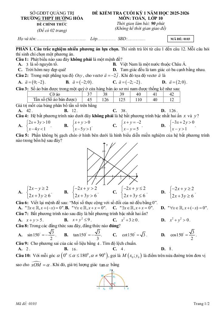 Trích dẫn Đề cuối kỳ 1 Toán 10 năm 2025 – 2026 trường THPT Hướng Hóa – Quảng Trị: