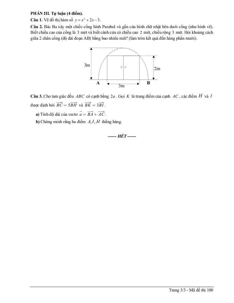 + Bác Ba xây một chiếc cổng hình Parabol và gắn cửa hình chữ nhật bên dưới cổng (như hình vẽ). Biết chiều cao của cổng là 3 mét và biết cánh cửa có chiều cao 2 mét, chiều rộng 3 mét. Hỏi khoảng cách giữa 2 chân cổng (độ dài đoạn AB) bằng bao nhiêu mét? (làm tròn kết quả đến hàng phần mười).