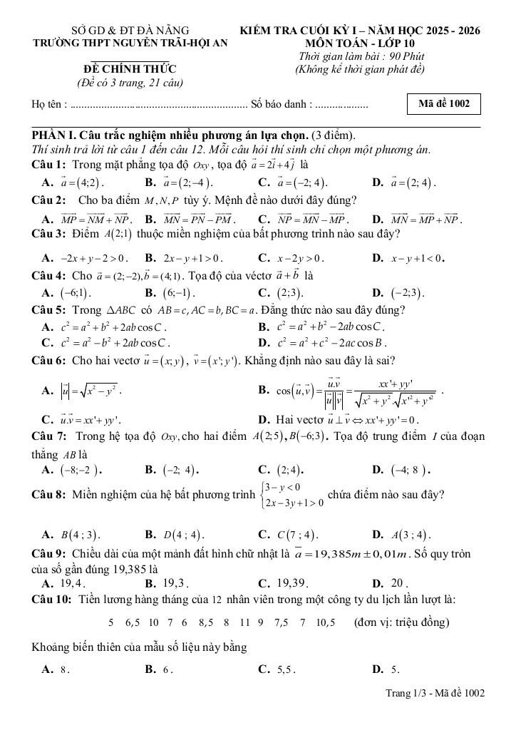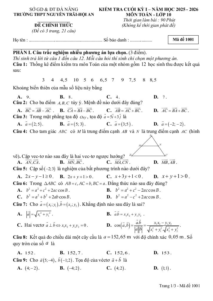 Trích dẫn Đề cuối kỳ 1 Toán 10 năm 2025 – 2026 trường THPT Nguyễn Trãi – Đà Nẵng: