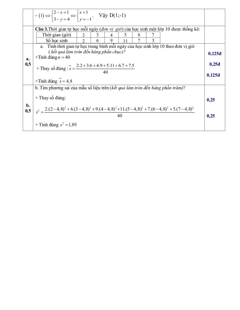 + Thời gian tự học mỗi ngày (đơn vị: giờ) của học sinh một lớp 10 được thống kê: Thời gian (giờ): 1 2 3 4 5 6 – Số học sinh: 3 7 4 12 8 6. a. Tính thời gian tự học trung bình mỗi ngày của các học sinh trong bảng số liệu trên? b. Tìm phương sai của mẫu số liệu trên (kết quả làm tròn đến hàng phần trăm)?