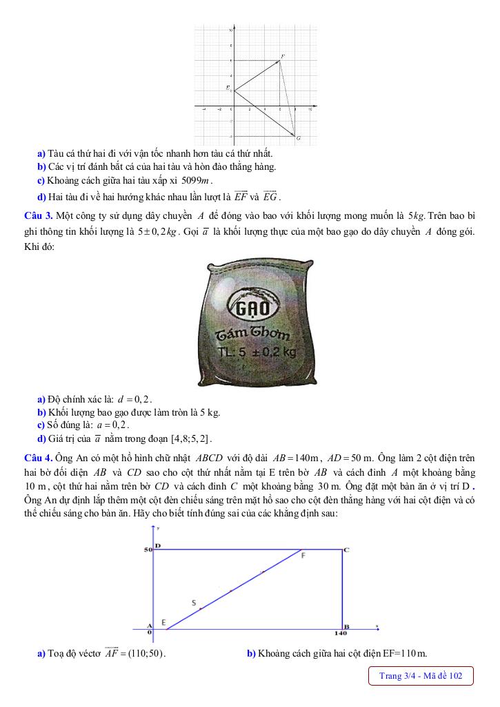 + Hai tàu cá cùng rời cảng, sau cùng một thời gian tàu cá thứ nhất đi đến vị trí F(6;6), tàu cá thứ hai đi đến vị trí G(8;-4) để đánh bắt cá. Hòn đảo nhỏ có tọa độ M(31/5;4). Chọn hệ trục tọa độ sao cho cảng cá trùng với điểm E và độ dài một đơn vị trên trục ứng với 500m trên thực tế. Các khẳng định sau đúng hay sai? a) Hai tàu đi về hai hướng khác nhau lần lượt là EF và EG. b) Tàu cá thứ hai đi với vận tốc nhanh hơn tàu cá thứ nhất. c) Khoảng cách giữa hai tàu xấp xỉ 5099m. d) Các vị trí đánh bắt cá của hai tàu và hòn đảo thẳng hàng.