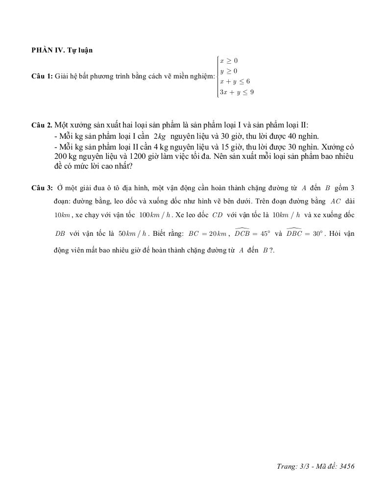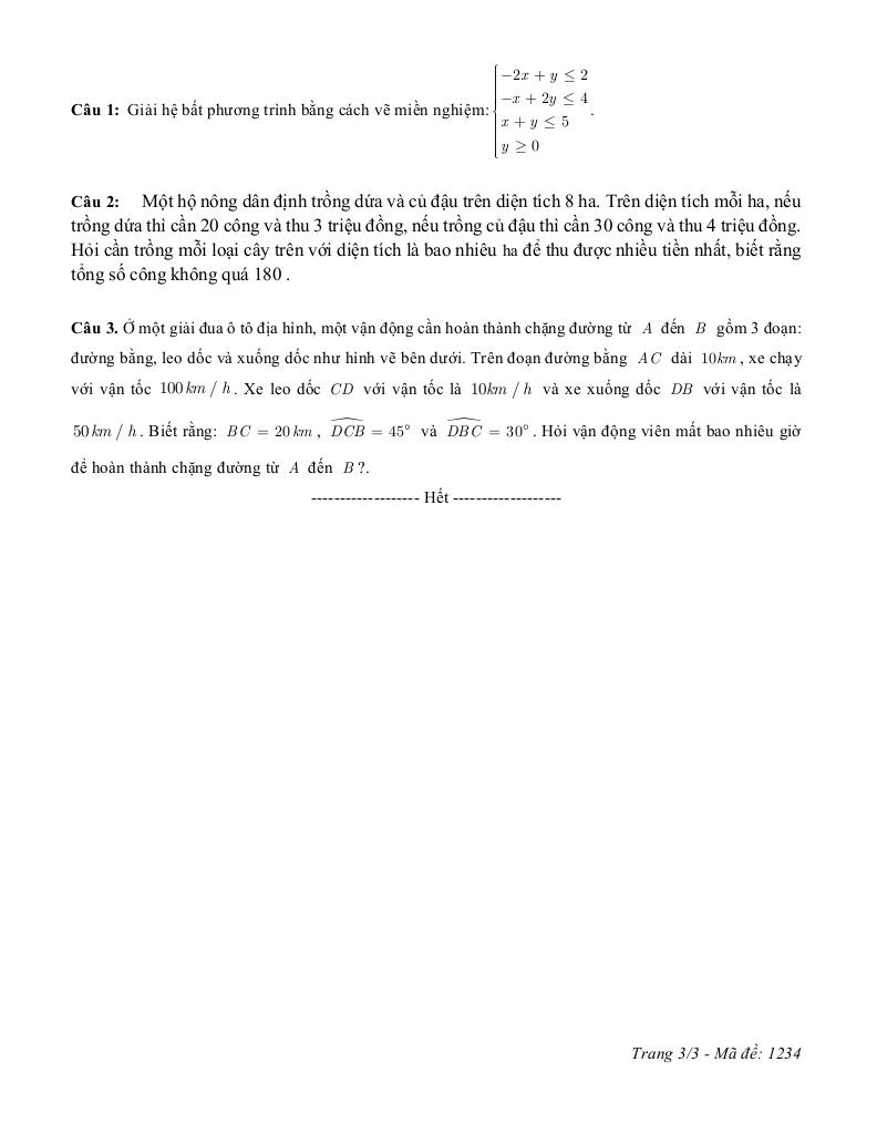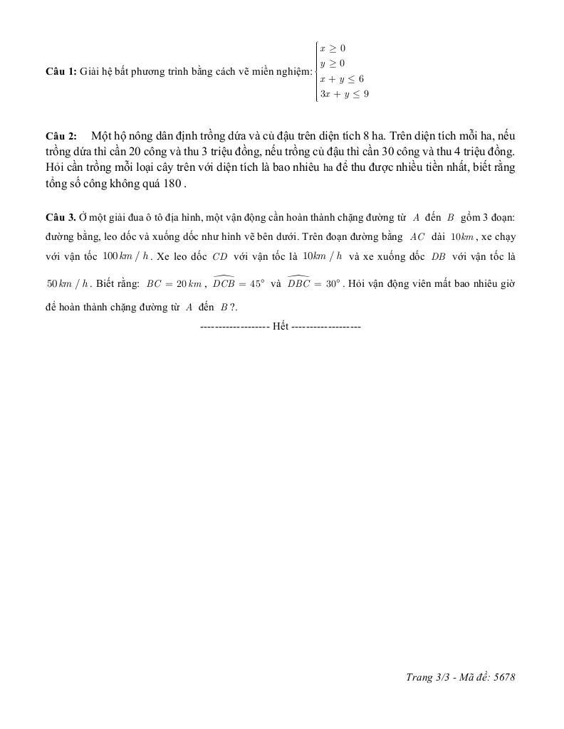 + Ở một giải đua ô tô địa hình, một vận động cần hoàn thành chặng đường từ A đến B gồm 3 đoạn: đường bằng, leo dốc và xuống dốc như hình vẽ bên dưới. Trên đoạn đường bằng AC dài 10km, xe chạy với vận tốc 100 km/h. Xe leo dốc CD với vận tốc là 10 km/h và xe xuống dốc DB với vận tốc là 50 km/h. Biết rằng: BC = 20km, DCB = 45 và DBC = 30. Hỏi vận động viên mất bao nhiêu giờ để hoàn thành chặng đường từ A đến B?