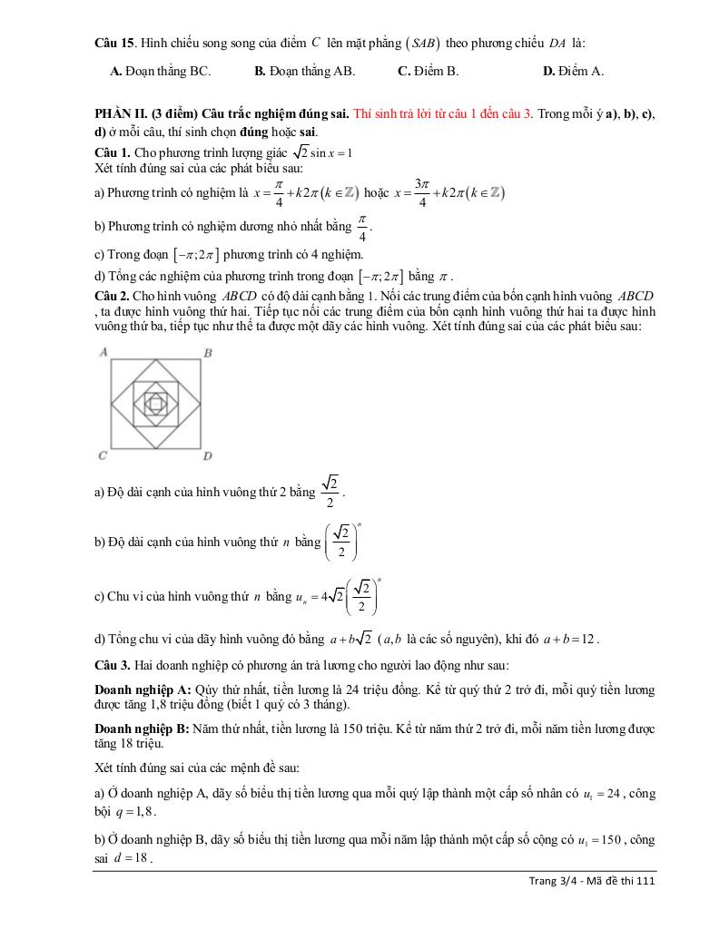 + Hai doanh nghiệp có phương án trả lương cho người lao động như sau: Doanh nghiệp A: Qúy thứ nhất, tiền lương là 24 triệu đồng. Kể từ quý thứ 2 trở đi, mỗi quý tiền lương được tăng 1,8 triệu đồng (biết 1 quý có 3 tháng). Doanh nghiệp B: Năm thứ nhất, tiền lương là 150 triệu. Kể từ năm thứ 2 trở đi, mỗi năm tiền lương được tăng 18 triệu. Xét tính đúng sai của các mệnh đề sau: a) Ở doanh nghiệp A, dãy số biểu thị tiền lương qua mỗi quý lập thành một cấp số nhân có u1 = 24, công bội q = 1,8. b) Ở doanh nghiệp B, dãy số biểu thị tiền lương qua mỗi năm lập thành một cấp số cộng có u1 = 150, công sai d = 18. c) Tổng số tiền doanh nghiệp B phải trả cho một người lao động trong 10 năm làm việc là 2300 triệu đồng. d) Một người lao động làm ở doanh nghiệp A trong 10 năm thì tổng số tiền lương nhận được sẽ nhiều hơn khi làm ở doanh nghiệp B cũng trong 10 năm.