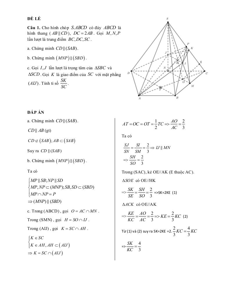 + Cho hình chóp giaitoan.edu.vn có đáy ABCD là hình thang (AB // CD), DC = 2AB. Gọi M, N, P lần lượt là trung điểm BC, DC, SC. a. Chứng minh CD // (SAB). b. Chứng minh (MNP) // (SBD). c. Gọi I, J lần lượt là trọng tâm của tam giác SBC và tam giác SCD. Gọi K là giao điểm của SC với mặt phẳng (AIJ). Tính tỉ số SK/KC.