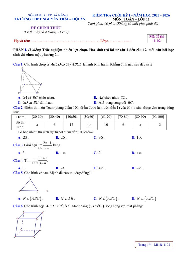 Trích dẫn Đề cuối kỳ 1 Toán 11 năm 2025 – 2026 trường THPT Nguyễn Trãi – Đà Nẵng:
