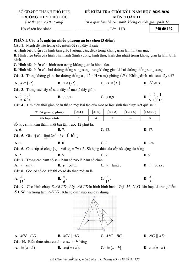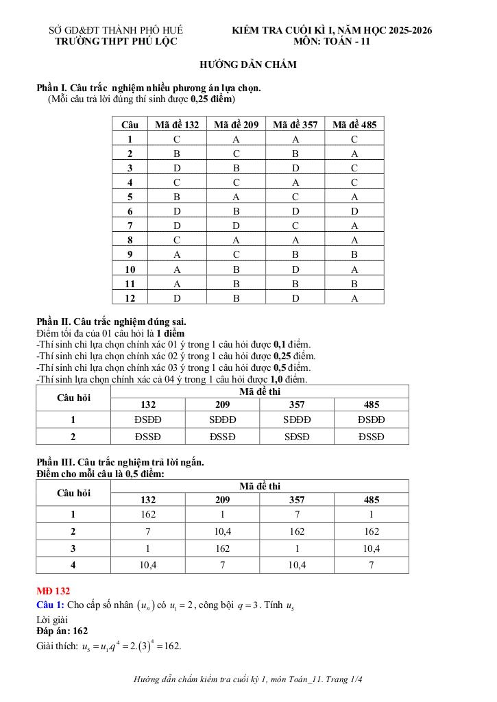 Giải Toán đề cuối kỳ 1 toán 11 năm 2025 – 2026 trường thpt phú lộc – huế với Đáp Án Mới Nhất