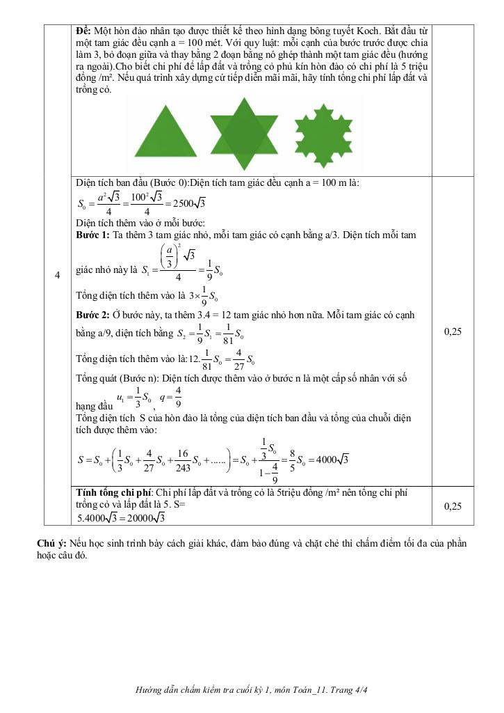 + Một hòn đảo nhân tạo được thiết kế theo hình dạng bông tuyết Koch. Bắt đầu từ một tam giác đều cạnh a = 100 mét. Với quy luật: mỗi cạnh của bước trước được chia làm 3, bỏ đoạn giữa và thay bằng 2 đoạn bằng nó ghép thành một tam giác đều (hướng ra ngoài). Cho biết chi phí để lấp đất và trồng cỏ phủ kín hòn đảo có chi phí là 5 triệu đồng/m². Nếu quá trình xây dựng cứ tiếp diễn mãi mãi, hãy tính tổng chi phí lấp đất và trồng cỏ.