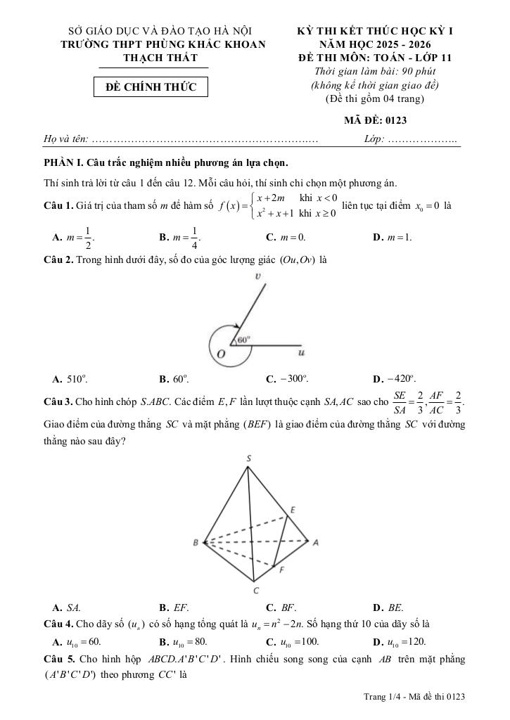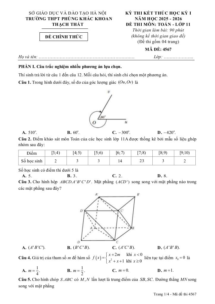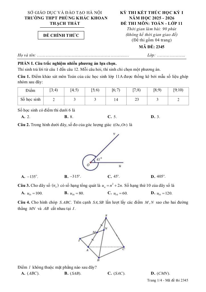 Trích dẫn Đề cuối kỳ 1 Toán 11 năm 2025 – 2026 trường THPT Phùng Khắc Khoan – Hà Nội: