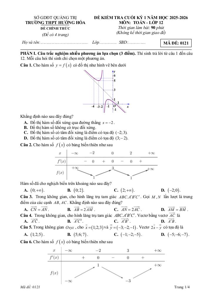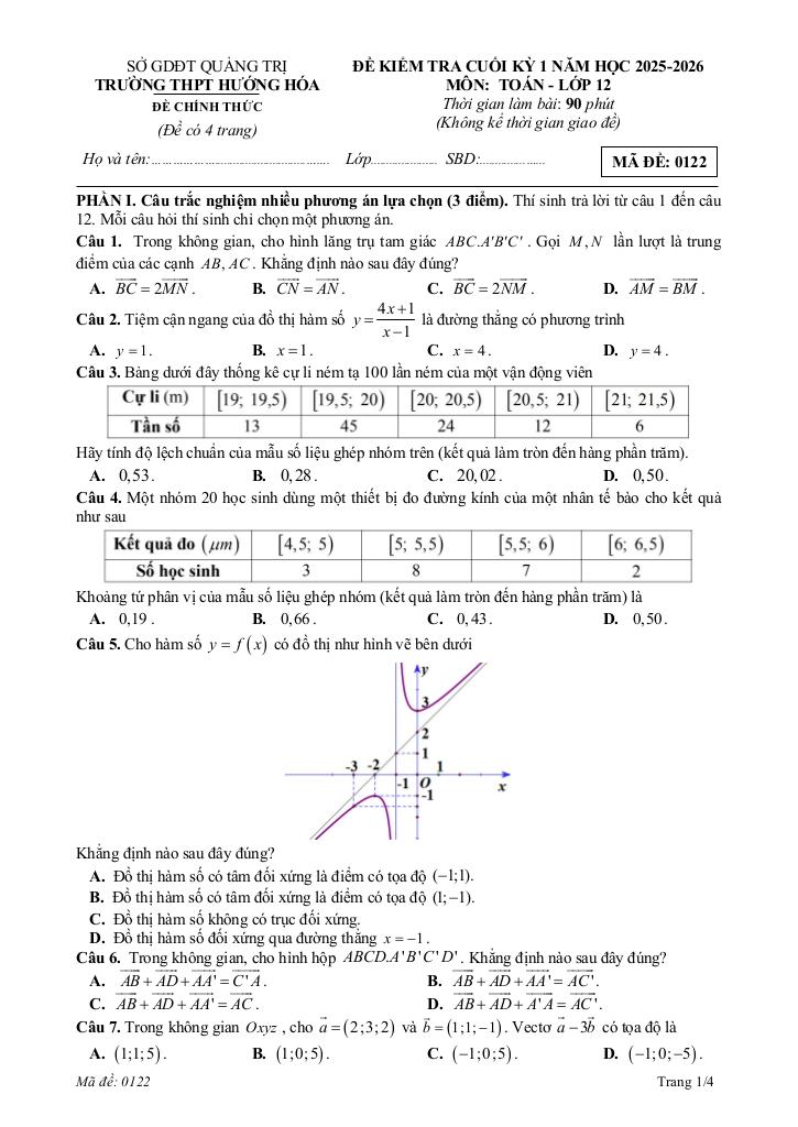 Trích dẫn Đề cuối kỳ 1 Toán 12 năm 2025 – 2026 trường THPT Hướng Hóa – Quảng Trị:
