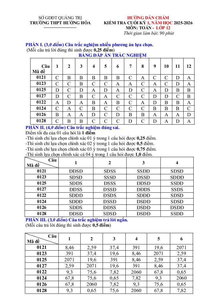giaitoan.edu.vn giới thiệu đến quý thầy, cô giáo và các em học sinh đề kiểm tra cuối học kỳ 1 môn Toán 12 năm học 2025 – 2026 trường THPT Hướng Hóa, tỉnh Quảng Trị. Đề thi có đáp án mã đề 0121 – 0122.