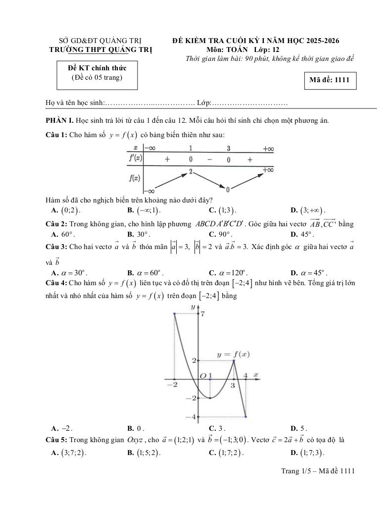 Trích dẫn Đề cuối kỳ 1 Toán 12 năm 2025 – 2026 trường THPT Quảng Trị – Quảng Trị: