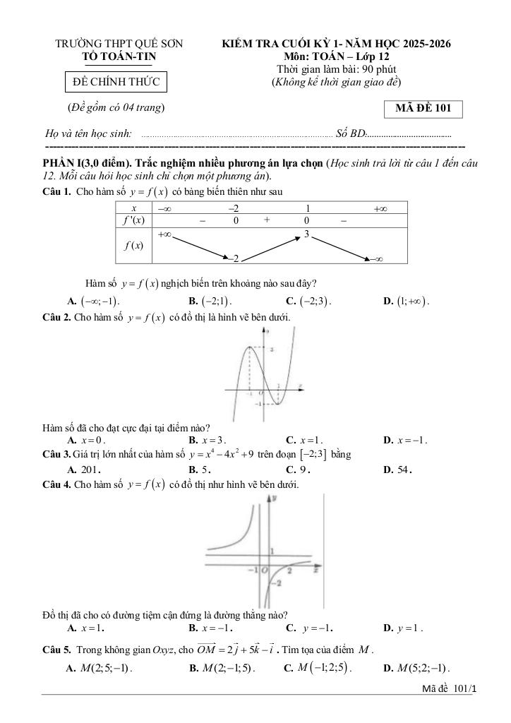 Trích dẫn Đề cuối kỳ 1 Toán 12 năm 2025 – 2026 trường THPT Quế Sơn – Đà Nẵng:
