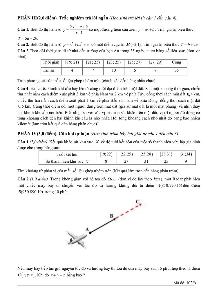 + Trong không gian với hệ tọa độ Oxyz (đơn vị đo lấy theo km), một Radar phát hiện một chiếc máy bay di chuyển với tốc độ và hướng không đổi từ điểm A(850;770;15) đến điểm B(950;790;17) trong 10 phút.
