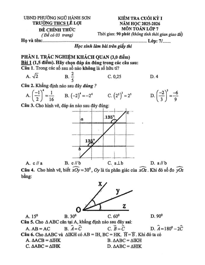 Trích dẫn Đề cuối kỳ 1 Toán 7 năm 2025 – 2026 trường THCS Lê Lợi – Đà Nẵng: