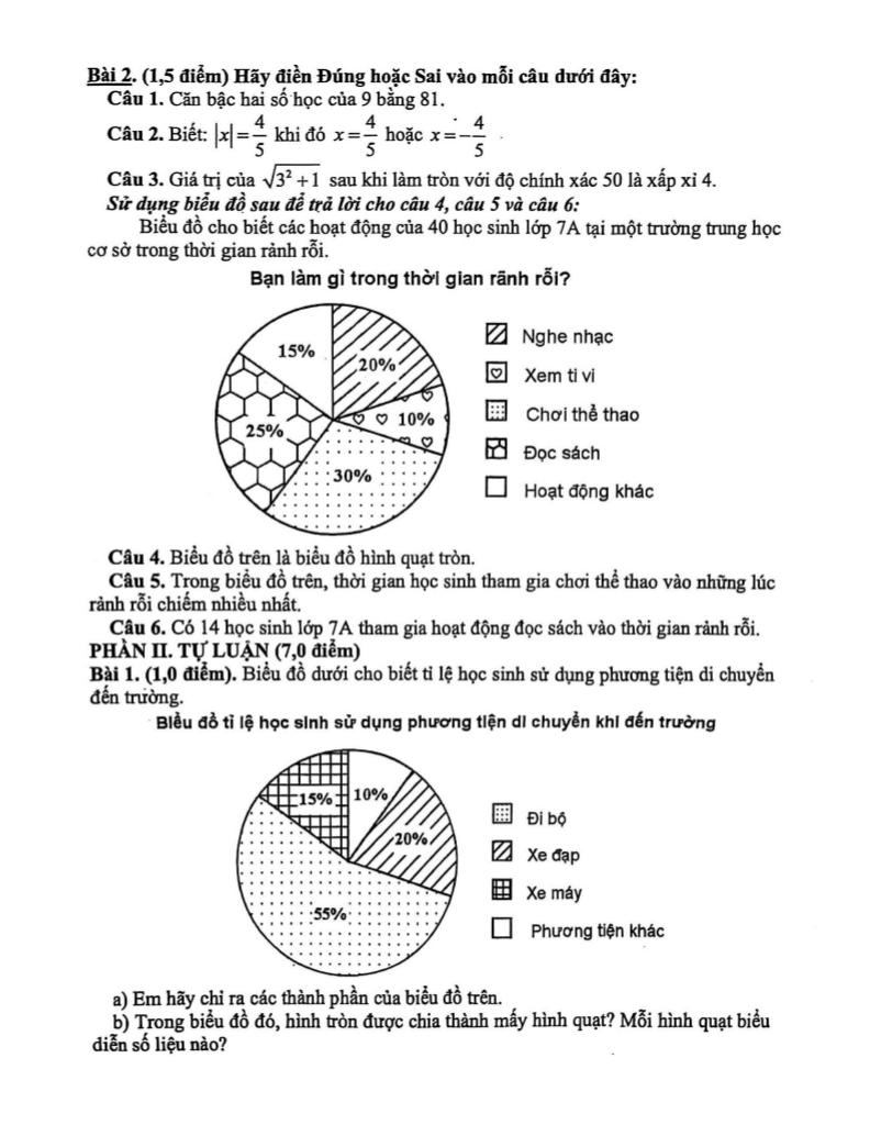 + Biểu đồ cho biết các hoạt động của 40 học sinh lớp 7A tại một trường trung học cơ sở trong thời gian rảnh rỗi. Bạn làm gì trong thời gian rảnh rỗi? Nghe nhạc – Xem ti vi – Chơi thể thao – Đọc sách – Hoạt động khác. Biểu đồ trên là biểu đồ hình quạt tròn. Trong biểu đồ trên, thời gian học sinh tham gia chơi thể thao vào những lúc rảnh rỗi chiếm nhiều nhất. Có 14 học sinh lớp 7A tham gia hoạt động đọc sách vào thời gian rảnh rỗi.