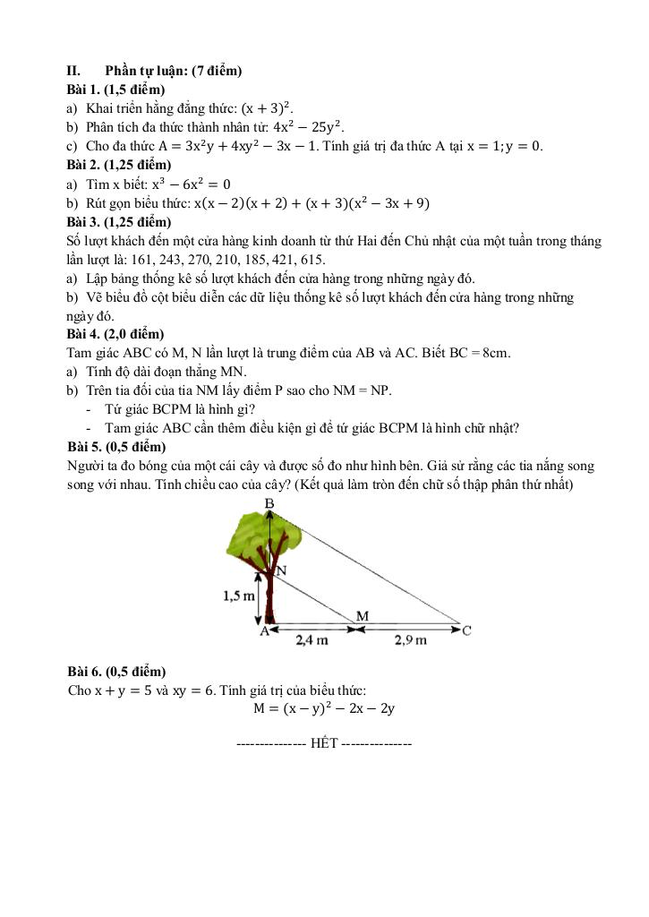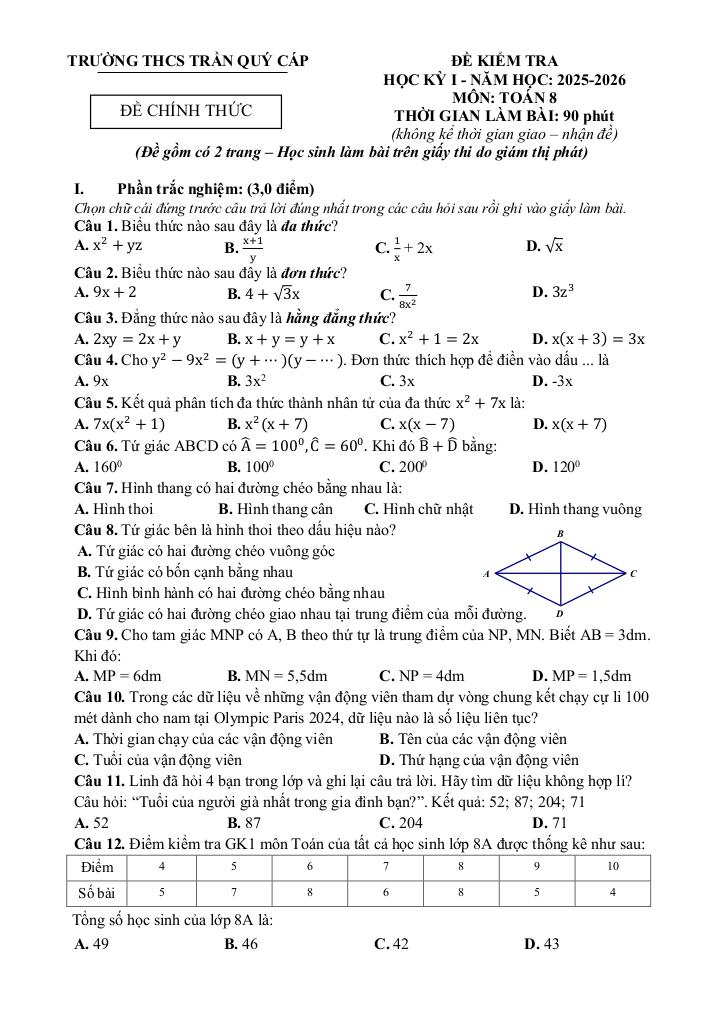 Trích dẫn Đề cuối kỳ 1 Toán 8 năm 2025 – 2026 trường THCS Trần Quý Cáp – Đà Nẵng: