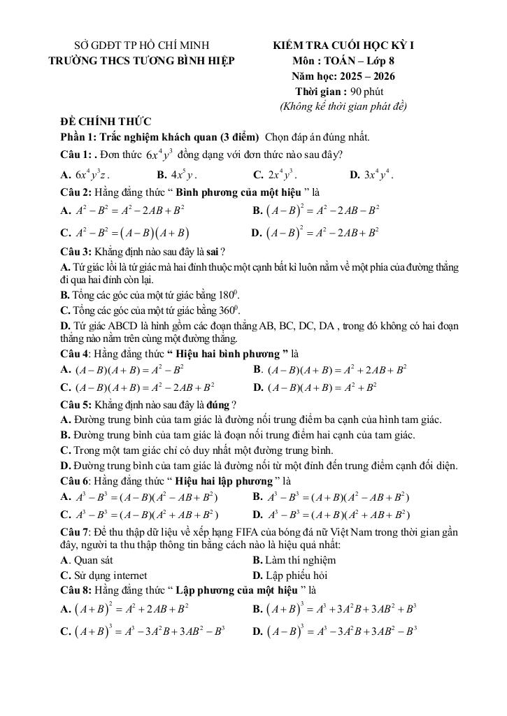 Trích dẫn Đề cuối kỳ 1 Toán 8 năm 2025 – 2026 trường THCS Tương Bình Hiệp – TP HCM: