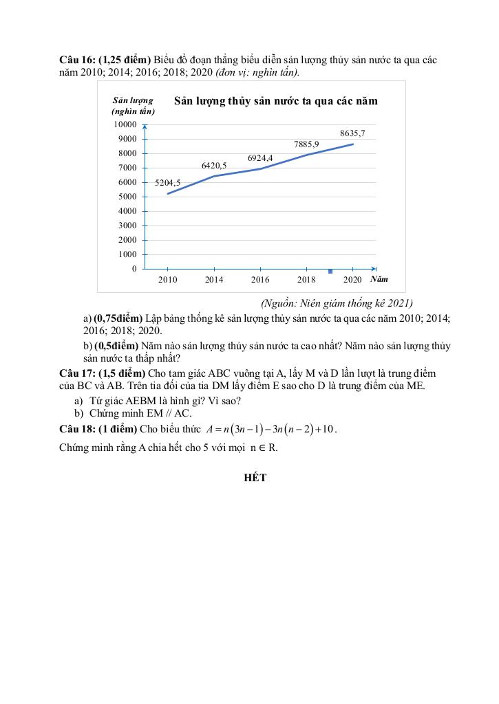 + Biểu đồ đoạn thẳng biểu diễn sản lượng thủy sản nước ta qua các năm 2010; 2014; 2016; 2018; 2020 (đơn vị: nghìn tấn). (Nguồn: Niên giám thống kê 2021). a) Lập bảng thống kê sản lượng thủy sản nước ta qua các năm 2010; 2014; 2016; 2018; 2020. b) Năm nào sản lượng thủy sản nước ta cao nhất? Năm nào sản lượng thủy sản nước ta thấp nhất?