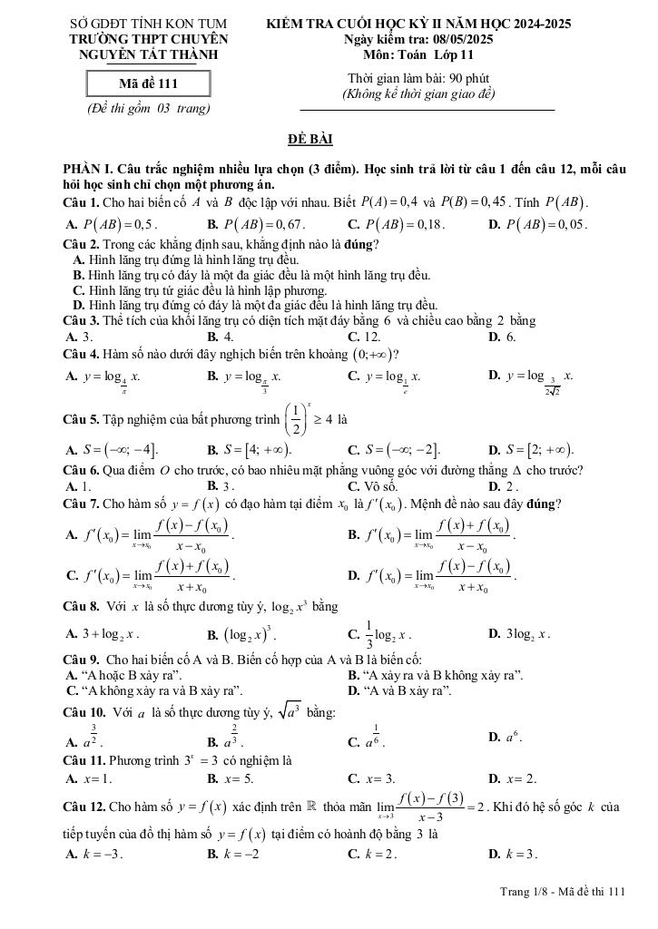 Toán học luôn là một môn học quan trọng, giúp học sinh phát triển tư duy logic và kỹ năng giải quyết vấn đề. Để hỗ trợ các bạn học sinh và giáo viên trong việc học tập và giảng dạy, bài viết này sẽ cung cấp lời giải chi tiết và đáp án chính xác cho chủ đề đề cuối kỳ 2 toán 11 năm 2024 – 2025 trường chuyên nguyễn tất thành – kon tum, giúp bạn hiểu sâu và tự tin hơn khi làm bài tập.