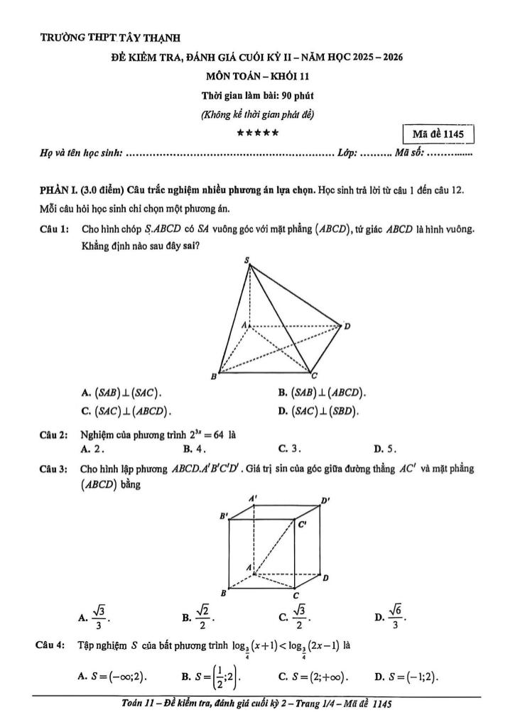 Giải Toán đề cuối kỳ 2 toán 11 năm 2025 – 2026 trường thpt tây thạnh – tp hcm với Đáp Án Mới Nhất