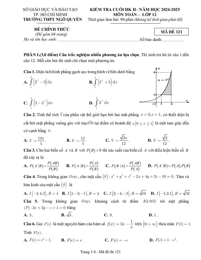 Trích dẫn Đề cuối kỳ 2 Toán 12 năm 2024 – 2025 trường THPT Ngô Quyền – TP HCM: