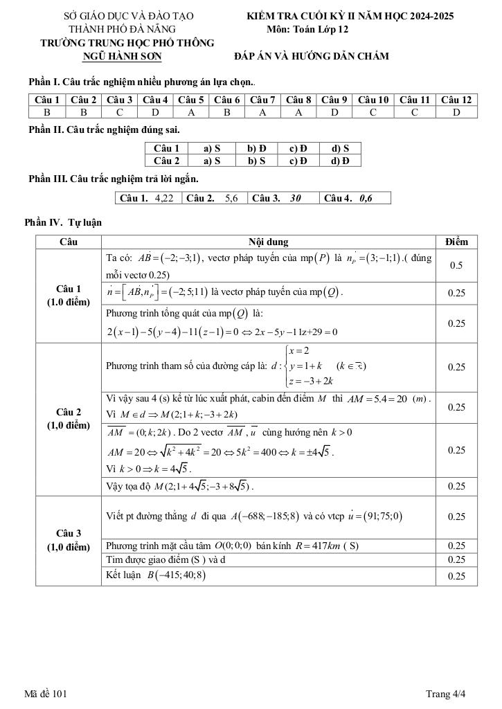 Giải Toán đề cuối kỳ 2 toán 12 năm 2024 – 2025 trường thpt ngũ hành sơn – đà nẵng với Đáp Án Mới Nhất