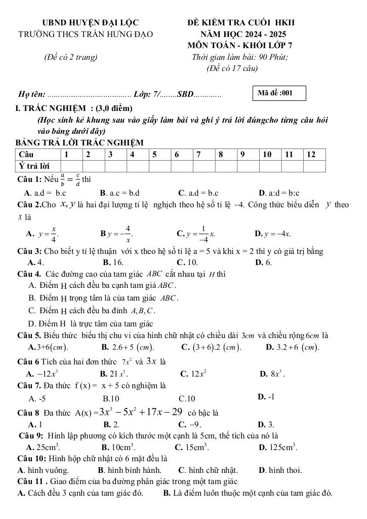 Giải Toán đề cuối kỳ 2 toán 7 năm 2024 – 2025 trường thcs trần hưng đạo – quảng nam với Đáp Án Mới Nhất