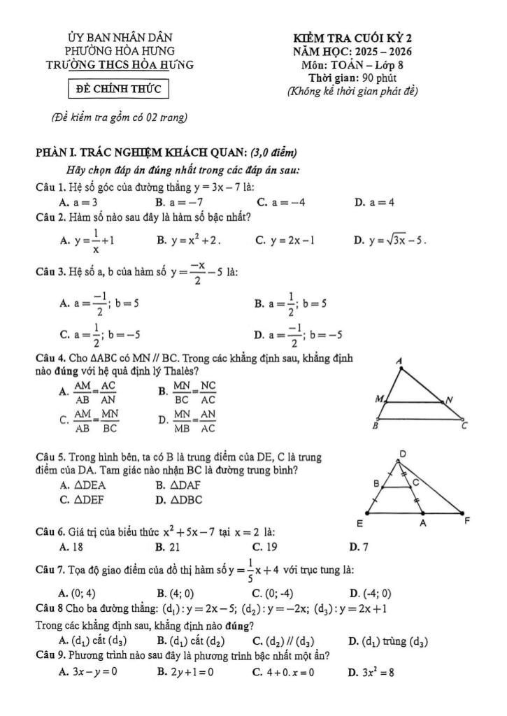 Trích dẫn Đề cuối kỳ 2 Toán 8 năm 2025 – 2026 trường THCS Hòa Hưng – TP HCM: