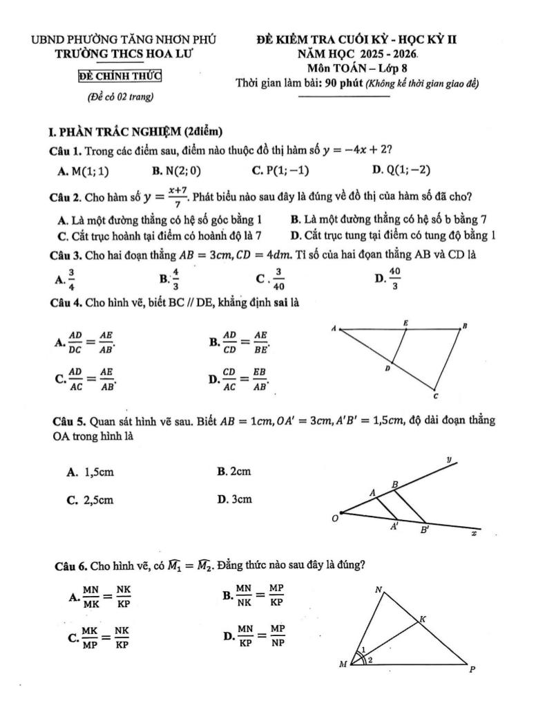 Trích dẫn Đề cuối kỳ 2 Toán 8 năm 2025 – 2026 trường THCS Hoa Lư – TP HCM: