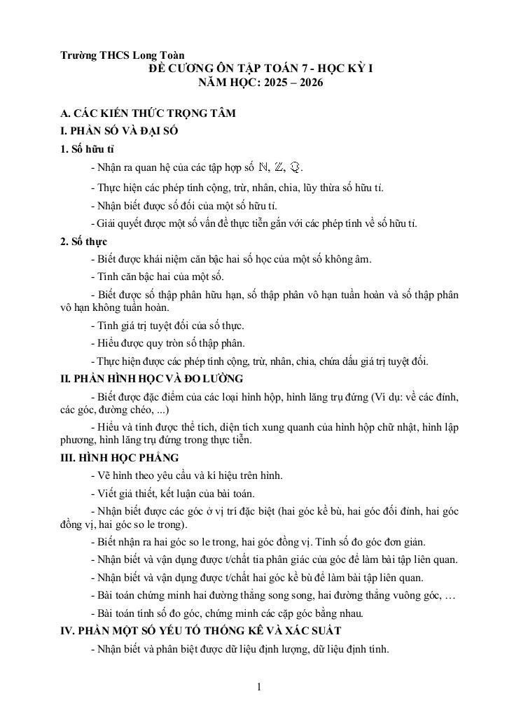 giaitoan.edu.vn giới thiệu đến quý thầy, cô giáo và các em học sinh đề cương ôn tập cuối học kì 1 môn Toán 7 năm học 2025 – 2026 trường THCS Long Toàn, phường Bà Rịa, thành phố Hồ Chí Minh.