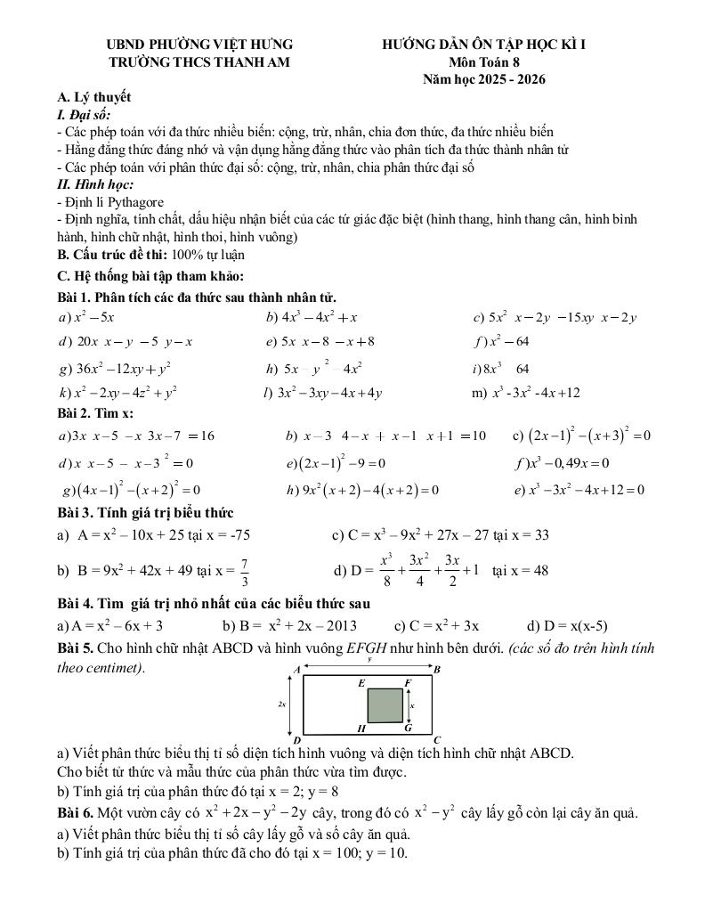giaitoan.edu.vn giới thiệu đến quý thầy, cô giáo và các em học sinh đề cương ôn tập kiểm tra cuối học kì 1 môn Toán 8 năm học 2025 – 2026 trường THCS Thanh Am, phường Việt Hưng, thành phố Hà Nội.