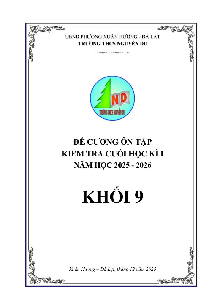 giaitoan.edu.vn giới thiệu đến quý thầy, cô giáo và các em học sinh đề cương ôn tập kiểm tra cuối học kì 1 môn Toán 9 năm học 2025 – 2026 trường THCS Nguyễn Du, phường Xuân Hương – Đà Lạt, tỉnh Lâm Đồng.