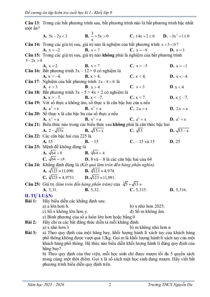 Giải Toán đề cương cuối học kì 1 toán 9 năm 2025 – 2026 trường thcs nguyễn du – lâm đồng với Đáp Án Mới Nhất